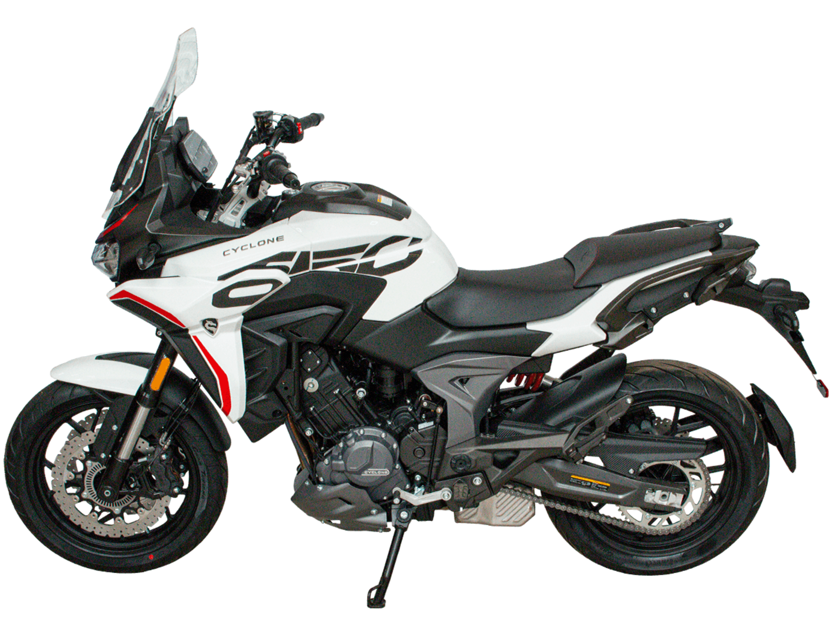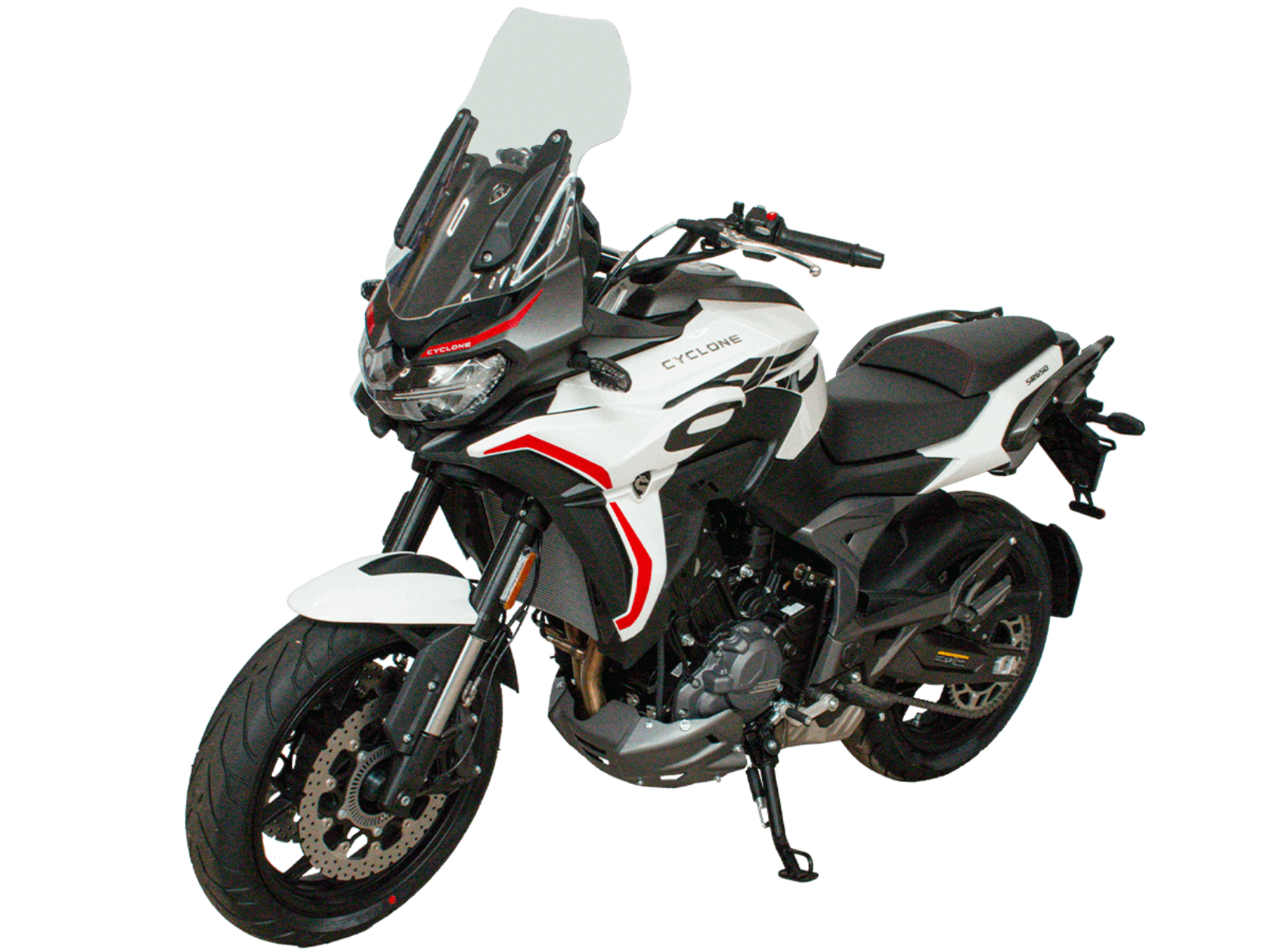 CYCLONE RX6 (SR650) – туристический эндуро для покорения самых непростых и протяжённых маршрутов. Он обладает агрессивным и современным дизайном, который выгодно выделяет его из всех остальных мотоциклов в своём классе. Мотоцикл дарит своему владельцу абсолютную свободу передвижения, позволяя долго и быстро ехать по шоссе, а при желании съезжать на такие дороги, по которым не проедет ни один дорожный мотоцикл. Небольшие габариты этого байка позволяют с успехом использовать его, как повседневный дорожный мотоцикл.Данная модель является самой крупнокубатурной в модельном ряде компании CYCLONE. Рядный двухцилиндровый четырёхтактный двигатель объёмом 650 см3 выдаёт мощность в 71 л.с. на 8500 об/мин. Максимальный крутящий момент достигается на 7000 об/мин и составляет 62 Н·м. Инжекторный впрыск топлива с блоком управления BOSCH увеличивает топливную экономичность, а также позволяет добиться высокой приёмистости и неприхотливости агрегата. Жидкостная система охлаждения не допустит перегрева двигателя даже при самом агрессивном вождении. На мотоцикл установлена 6-ступенчатая механическая коробка передач.Максимальная скорость мотоцикла составляет 180 км/ч.Модель оснащена литыми алюминиевыми дисками диаметром 17 дюймов. Колёса обуты в бескамерные покрышки от легендарной фирмы PIRELLI. С неровностями дороги эффективно справляются компоненты производства культовой японской компании KYB – телескопическая вилка перевёрнутого типа спереди и маятник с моноамортизатором сзади. Ход передней подвески составляет 130 мм, задней – 51 мм. Оба компонента подвески являются регулируемыми. Эффективное и безопасное замедление с любых скоростей обеспечивают гидравлические дисковые тормоза с двухканальной системой ABS спереди и сзади. Тормозные системы произведены известной испанской фирмой J.JUAN (входящей в легендарный холдинг BREMBO).Мотоцикл отличает хорошо продуманная компоновка с высоко расположенным радиатором. Высота 820 мм по седлу позволяет чувствовать себя комфортно даже райдерам небольшого роста. На данной модели установлена металлическая защита выхлопной системы и масляного фильтра. Под пассажирским сиденьем размещён небольшой, но крайне полезный набор инструментов.RX6 (SR650) оснащён бортовым компьютером с информативным цветным дисплеем и кнопками управления на руле, а также двумя штатными видеорегистраторами спереди и сзади. Из других приятных мелочей в допоборудовании мотоцикла стоит выделить регулируемое при помощи кнопки ветровое стекло, датчики давления в шинах, подсветку пультов, бесключевой доступ и 2 USB-порта.Клиренс мотоцикла составляет 165 мм. Объём топливного бака – 20 л. Снаряжённая масса – 245 кг.Мотоцикл сочетает в себе отличные технические характеристики, богатое оснащение, комфорт и надёжность, что позволяет вам ощутить настоящую свободу, отправившись на нём в любое путешествие.