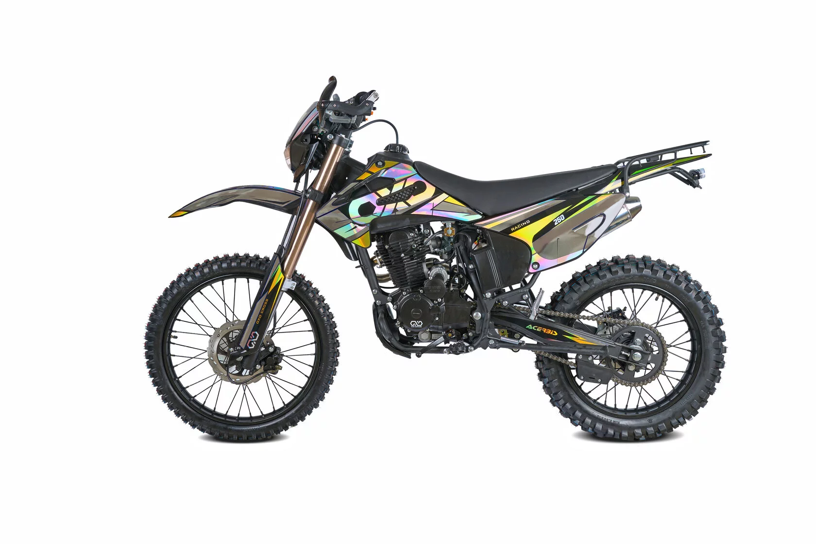 ДвигательДвигатель ZS165FMM - 4-тактный двигатель воздушного охлаждения объёмом 223 куб см с двумя клапанами, оснащён балансировочным валом, благодаря которому уменьшается избыточная вибрация, передаваемая от двигателя на раму и общую конструкцию техники. Характеризуется хорошей тягой с самых низов и лёгким пуском с помощью электростартера. Двигатель отлично зарекомендовал себя в качестве надёжного, универсального, неприхотливого мотора с хорошими характеристиками.РамаРама мотоцикла OXO производится из труб шестигранного сечения хром-молибденовой стали, которая является очень прочной и легкой. Геометрия рамы, благодаря правильно выверенному центру тяжести и углу наклона вилки - способствует наилучшей управляемости устойчивости мотоцикла на низкой скорости.ПодвескаПередняя вилка перевернутого типа. Мотоцикл LITE 250 снабжен моноамортизатором, который соединен посредством системы рычагов прогрессии. Система прогрессии, обеспечивает равномерную, мягкую работу и увеличивает длину рабочего хода подвески.КолесаРазмер передней покрышки: 80/100-21. Размер задней покрышки: 120/100-18. Они прекрасно себя ведут по песку и грязи, что позволяет райдеру отлично показать себя на пересеченной местностиТормозная системаТормозная система мотоцикла - полностью гидравлическая с армированными шлангами. Спереди и сзади установлен двухпоршневой суппорт. Данная конфигурация тормозных механизмов, позволит быстро и безопасно остановиться с максимальной скорости даже на бездорожье.РульВажная часть современного эндуро мотоцикла - усиленный руль переменного сечения Мотоцикл укомплектован панелью приборов..