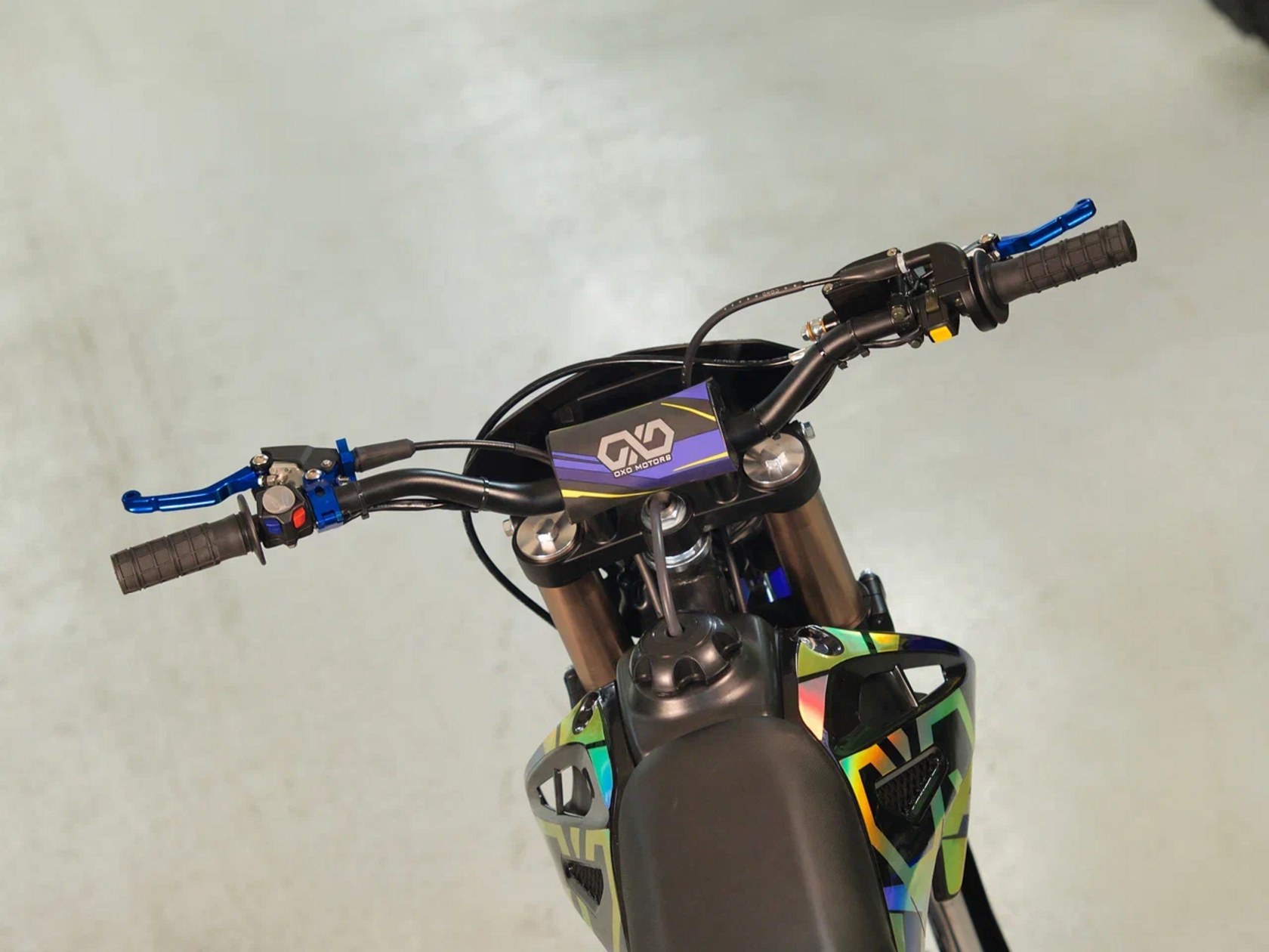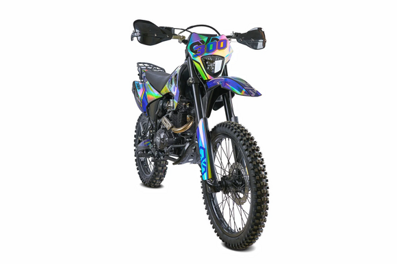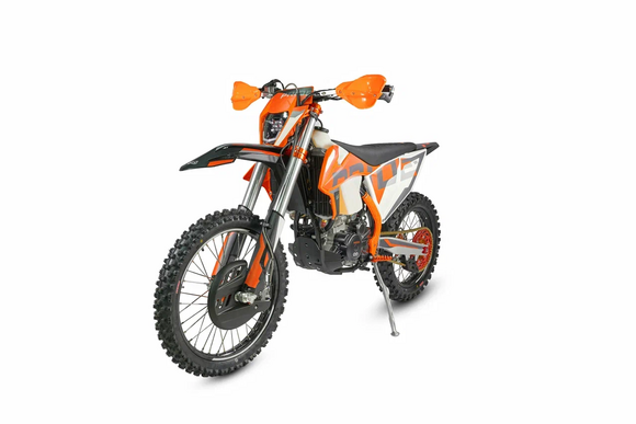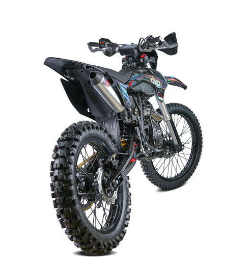 ДвигательДвигатель ZS165FMM - 4-тактный двигатель воздушного охлаждения объёмом 223 куб см с двумя клапанами, оснащён балансировочным валом, благодаря которому уменьшается избыточная вибрация, передаваемая от двигателя на раму и общую конструкцию техники. Характеризуется хорошей тягой с самых низов и лёгким пуском с помощью электростартера. Двигатель отлично зарекомендовал себя в качестве надёжного, универсального, неприхотливого мотора с хорошими характеристиками.РамаРама мотоцикла OXO производится из труб шестигранного сечения хром-молибденовой стали, которая является очень прочной и легкой. Геометрия рамы, благодаря правильно выверенному центру тяжести и углу наклона вилки - способствует наилучшей управляемости устойчивости мотоцикла на низкой скорости.ПодвескаПередняя вилка перевернутого типа. Мотоцикл снабжен моноамортизатором, который соединен посредством системы рычагов прогрессии. Система прогрессии, обеспечивает равномерную, мягкую работу и увеличивает длину рабочего хода подвески.КолесаРазмер передней покрышки: 80/100-21. Размер задней покрышки: 120/100-18. Они прекрасно себя ведут по песку и грязи, что позволяет райдеру отлично показать себя на пересеченной местности.Тормозная системаТормозная система мотоцикла - полностью гидравлическая с армированными шлангами. Спереди и сзади установлен двухпоршневой суппорт. Данная конфигурация тормозных механизмов, позволит быстро и безопасно остановиться с максимальной скорости даже на бездорожье.РульВажная часть современного эндуро мотоцикла - усиленный руль переменного сечения. На руле установлен рычаг заслонки подсоса. Алюминиевая ручка газа с коротким ходом имеет регулировку троса. Также мотоцикл укомплектован электронной панелью приборов..
