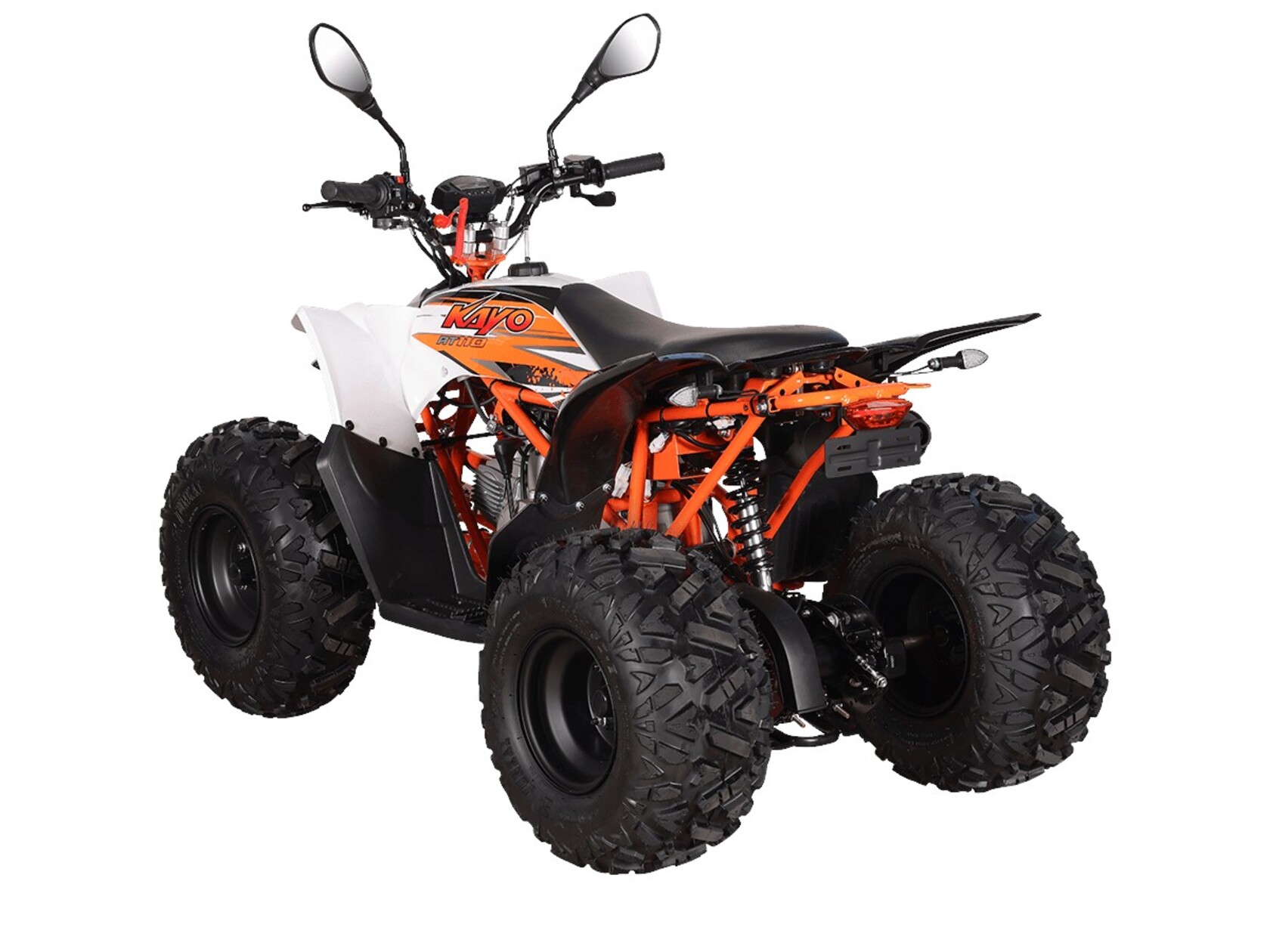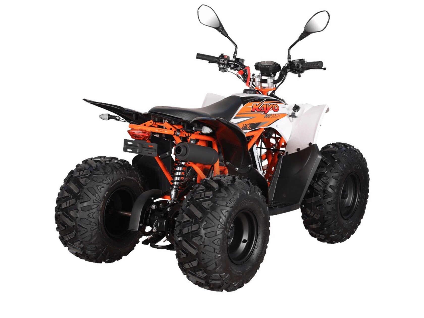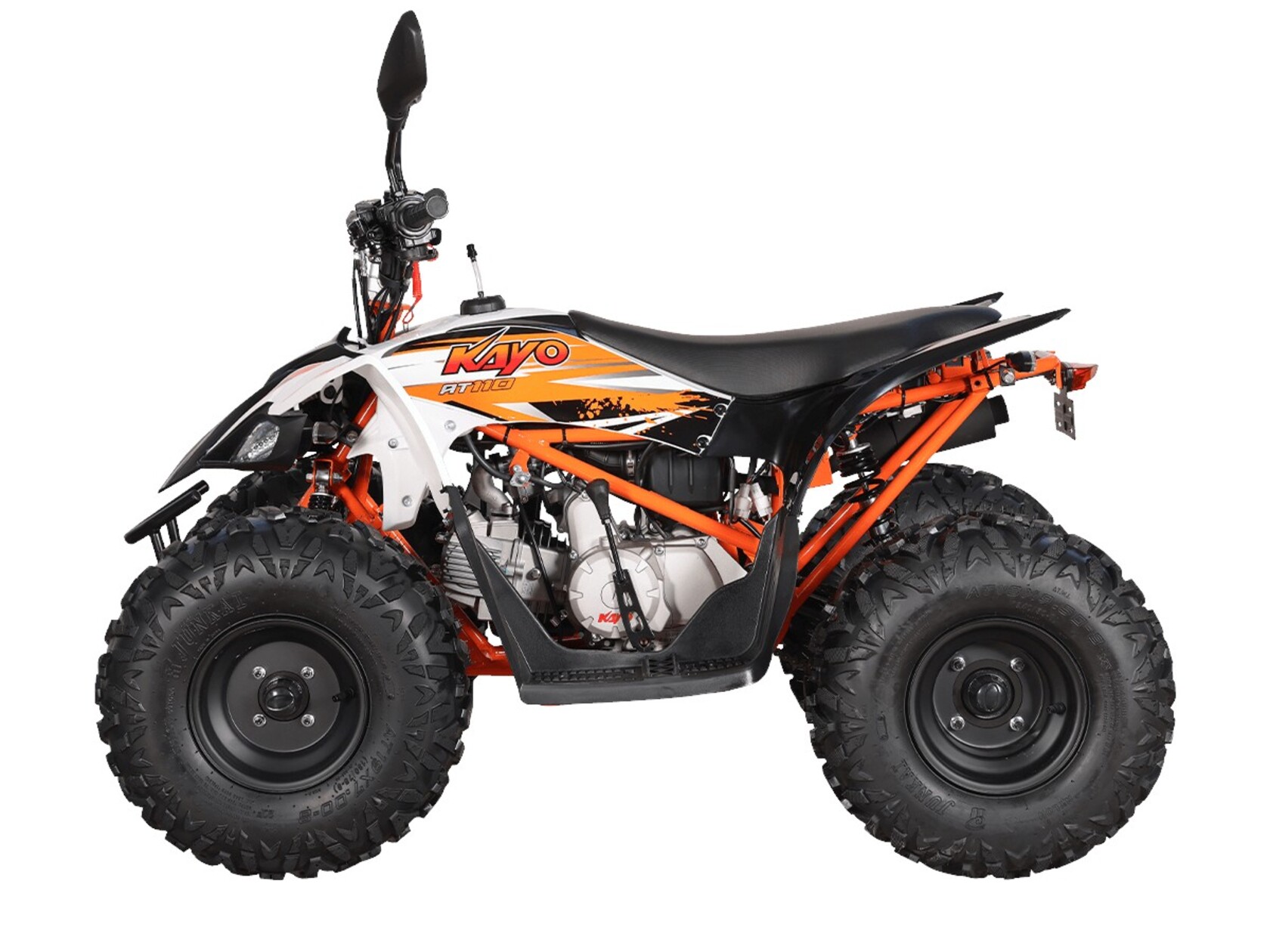 Квадрицикл KAYO AT110 – выносливая модель для освоения спортивной езды по бездорожью или помощи в хозяйстве. Хорошо подходит для детей и подростков, интересующихся поездками за пределами проторенных троп.Одноцилиндровый 4-тактный двигатель YX1P53FMH-2 с верхним распредвалом и воздушным охлаждением имеет объём 107 см3. Максимальная мощность 7,2 л.с. За подачу топлива отвечает карбюратор. Привод осуществляется на 2 колеса. Трансмиссия имеет автоматическую коробку передач со схемой F-N-R.Запуск осуществляется с помощью системы электронного зажигания. Имеется функция родительского дистанционного выключения двигателя.На квадрицикле используются колёса диаметром 8 дюймов. Амортизаторы подвески имеют длину 265 мм, задние можно регулировать. За торможение отвечает гидравлическая дисковая система. Клиренс составляет 110 мм, колёсная база 920 мм.Габариты модели 1360х840х880 мм, высота по седлу 660 мм, вес 98 кг. Ёмкость бака 4 литра.Наличие ПТС позволяет зарегистрировать технику на дорогах общего пользования.