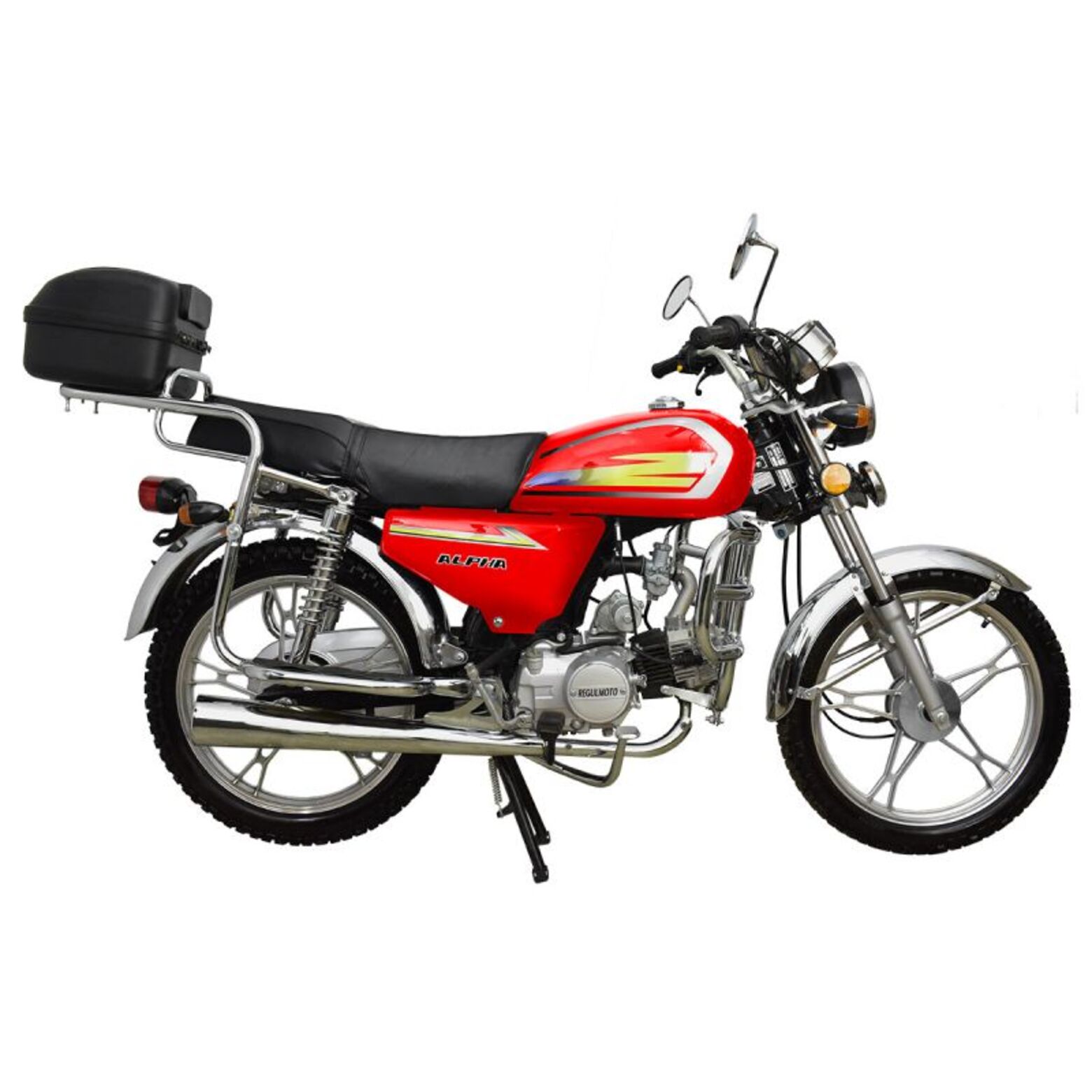 Regulmoto Alpha (RM-1) 110сс – «живая классика» китайской мотоиндустрии, один из самых доступных представителей двухколесного транспорта утилитарного назначения. Новое поколение Alpha готово продемонстрировать улучшенные показатели производительности, высокую надежность в повседневной эксплуатации и традиционную неприхотливость в сервисном обслуживании. Данный мопед комплектуется надежным «кабовским» двигателем – одноцилиндровым 4-тактником воздушного охлаждения с 4-ступенчатой трансмиссией. Рабочий объем мотора увеличен до 110 см3 благодаря установке нового комплекта ЦПГ на заводе-изготовителе. Запуск двигателя возможно осуществить как при помощи кнопки электрострартера, так и при помощи рычага традиционного кик-стартера. Увеличение рабочего объема мотора заметно сказывается как на максимальной развиваемой мощности, которая составляет чуть больше семи лошадиных сил, так и на эксплуатационных характеристиках техники.Среди других усовершенствований комплектации обновленного Regulmoto Alpha (RM-1) следует отметить более мощные передние амортизаторы (диаметр до 28 миллиметров), усиленные тросы переднего тормоза и сцепления, современную светодиодную лампу в фаре головного света. Кроме того, на Regulmoto Alpha (RM-1) установлен полный комплект светотехники, зеркала заднего вида, аналоговая приборная панель, на которой отображаются пробег, скорость, выбранная передача, обороты двигателя, индикаторы работы поворотников и фары. Также имеются подножки для пассажира, багажный кофр, кожух защиты цепи и дуги безопасности.Владелец новенького Regulmoto Alpha (RM-1) по достоинству оценит экономичный двигатель, высокую надежность конструктивных решений и доступную стоимость сервисного обслуживания техники. Мопед полностью готов к комфортному использованию на дорогах города и проселках пригорода и способен успешно справляться с широким кругом эксплуатационных задач.