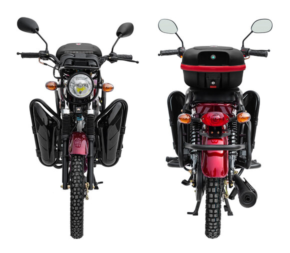 Комплектация Тормозная система – два барабанных тормоза. Усиленные тросы переднего тормоза и сцепления. Кроме того, на Regulmoto Alpha (RM-3) установлены зеркала заднего вида, подножки для пассажира, багажный кофр, пластиковые бардачки, кожух защиты цепи и дуги безопасности.