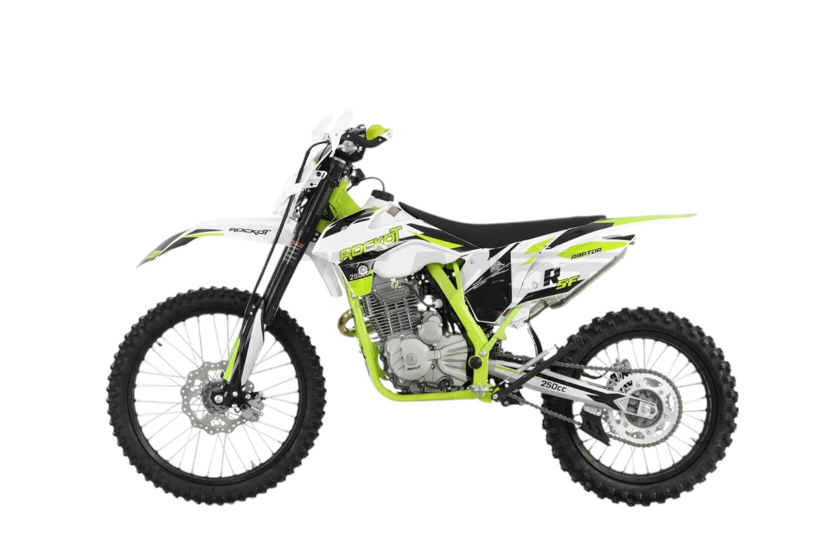R5F Raptor 2.0 - популярная модель среднеразмерного эндуро мотоцикла в линейке марки ROCKOT, которая заслуженно занимает лидирующие позиции среди множества моделей данного класса и ценового сегмента. То, что из себя представляет модель R5F Raptor, является результатом многолетней работы инженеров завода, технических специалистов компании Rockot-Motors и обратной связи нескольких тысяч райдеров ,связавших свой мотоциклетный путь с данной моделью.ДизайнПоследнее обновление, связанное с дизайном версии 2.0, заключается в едином графическом оформлении всей линейки серии R5, которая значительно расширилась в 2024-2025 годах. R5F имеет все ту же цветовую гамму, состоящую из ярко-зеленого, черного и белого цветов. Как и прежде, мотоцикл имеет облицовочный пластик в стиле KTM 15`, который широко распространен в классе среднеразмерных эндуро. Рама окрашена в зеленый цвет, аналогичный расцветке графики. Двигатель, элементы передней и задней подвески окрашены в серебристый цвет, что гармонично сочетается с элементами белого пластика и ярко контрастирует с черными колесными дисками, траверсами и органами управления.РамаРама мотоцикла ROCKOT R5F Raptor 2.0 является его визитной карточкой, превознося мотоцикл в верх рейтинга среднеразмерных эндуро мотоциклов. Особенность рамы заключается в ее конструкции, которая имеет в передней части две цельные трубы, идущие от рулевой колонки до задней части, где крепится маятник задней подвески. Боковая часть рамы состоит из плоских труб с шестигранным сечением профиля. Именно это являлось одним из последних обновлений рамы. Также обновленная модель получила новую схему крепления боковой подножки, что сделало этот узел более надежным. Рама производится из хром-молибденового сплава стали, который является очень прочным и легким.ПодвескаПередняя и задняя подвеска имеют большой рабочий ход. В передней подвеске этого удалось достичь благодаря длине амортизаторов 830 мм, а сзади - благодаря системе подвески с рычагами прогрессии. Толщина рабочих штоков передних амортизаторов составляет 37 мм, что уже является стандартом для данного класса мотоциклов. Длина заднего амортизатора составляет 450 мм. Задний амортизатор имеет регулировки скорости отбоя и преднатяга пружины. Система рычагов прогрессии не только увеличивает рабочий ход задней подвески, но и делает работу передних и заднего амортизаторов более равномерной и прогнозируемой.КолесаЭндуро мотоцикл ROCKOT R5F Raptor 2.0 оснащается усиленными колесными дисками из легкого алюминиевого сплава. Спереди и сзади установлены шины с внедорожным протектором, размерностью 80/100-21 спереди и 100/90-18 сзади.Тормозная системаПередняя тормозная система состоит из вентилируемого тормозного диска диаметром 240 мм и двухпоршневого суппорта с фирменным тормозным цилиндром на руле. Сзади установлен тормозной диск того же диаметра и однопоршневый суппорт.ДополнительноВ базовой комплектации мотоцикл оснащен усиленным алюминиевым рулем переменного сечения 22/28. Рычаги переднего тормоза и сцепления под надежной армированной защитой с прочными эластичными щитками.