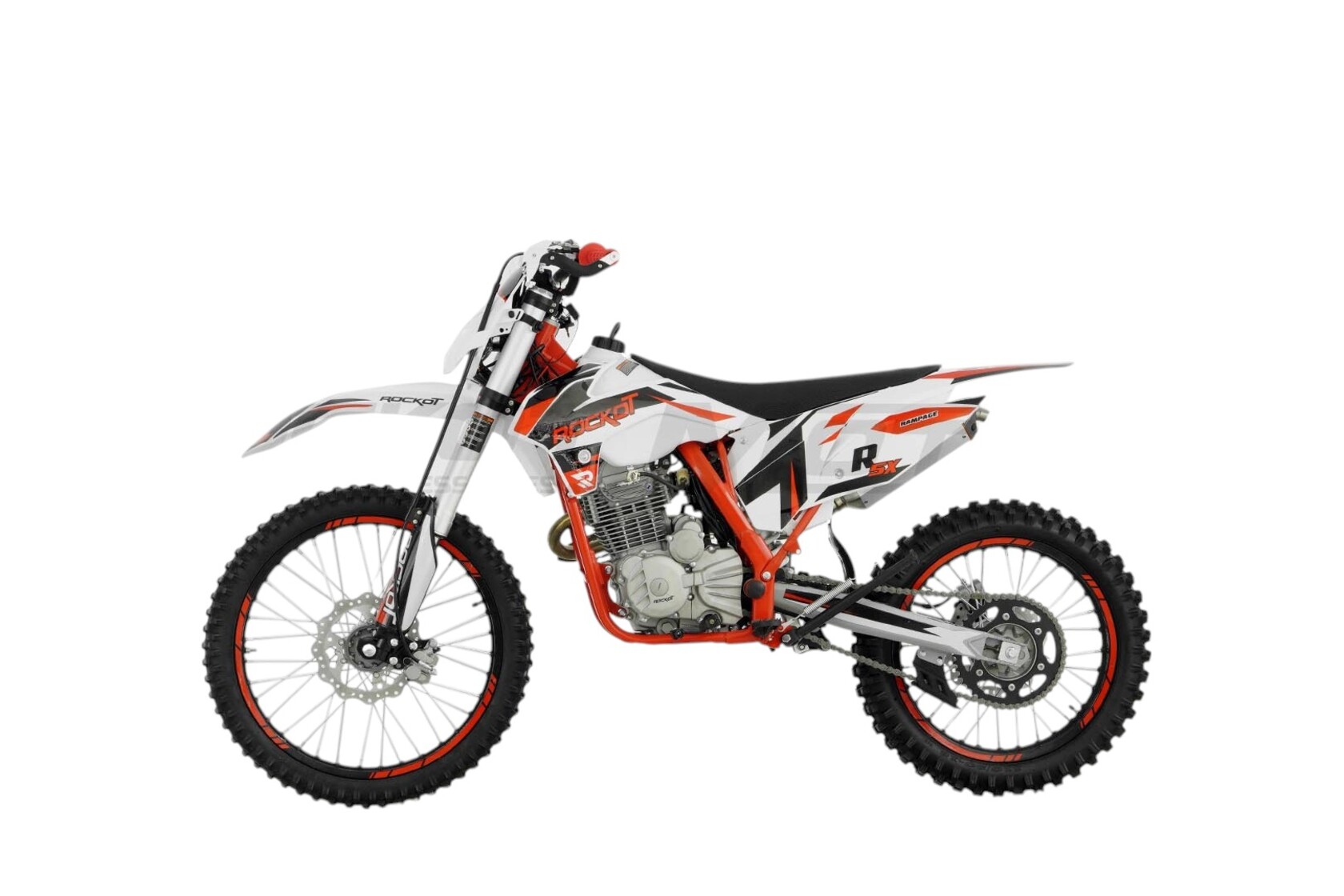 ROCKOT R5X Rampage - среднеразмерный эндуро мотоцикл, являющийся продолжением линейки R Series мотоциклов марки ROCKOT. Байк создан на базе уже “народных” мотоциклов ROCKOT R5F Raptor и R5 Cyclone.Обращаясь к дизайну мотоцикла, видно, что он построен на основе трех цветов: белого, красного и черного, сочетание которых подчеркивает его качества и представляет перед нами легкий, мощный и надежный эндуро мотоцикл.Белый пластик в стиле КТМ15 оклеен в прочную пленку с графикой в основных цветах модели. Рама мотоцикла окрашена в яркий красный цвет, что визуально придает байку свой спортивный характер. На ободах черных алюминиевых дисков нанесены защитные наклейки красного цвета. Все остальные элементы, такие как двигатель, маятник, передние и задний амортизаторы, глушитель окрашены в серебристый цвет, что также придает визуальную легкость байку. ROCKOT R5X Rampage имеет самый большой и мощный двигатель из возможных в линейке R - 175FMN CB250 от завода Zonsen (в 2023 году компания Zongshen провела ребрендинг и сменила имя), мощностью 24 лошадиные силы. Фактически, это тот же народный 172-ой, но с увеличенным цилиндром (Big Bore) на 271 см³.Данная модель двигателя славится своей простотой и надежностью, что и позволило ему стать самым популярным двигателем для эндуро мотоциклов.Коробка передач - пятиступенчатая, с многодисковым сцеплением в масляной ванне. Двигатель оснащен электростартером, но и кик-стартер остался на месте, ведь для использования мотоцикла в эндуро это очень важно.Выхлопная система выполнена из нержавеющей стали (приемная труба) и алюминиевого глушителя.За образование и подачу топливной смеси отвечает карбюратор PE28, чья конструкция также проста и надежна, как и сам двигатель. Эндуро мотоцикл ROCKOT R5X построен на среднеразмерной раме типа “К5” из хром-молибденового сплава стали, что дает ей высокую прочность и малый вес. Геометрия рамы обеспечивает высокий уровень управляемости и маневренности, а также стабильность на высокой скорости, несмотря на короткую базу в 1350 мм. Подвеска является одним из важнейших элементов эндуро мотоцикла. Поэтому здесь установлена длинноходная вилка спереди и моноамортизатор с системой рычагов прогрессии сзади. Длина передних амортизаторов составляет 830 мм, а толщина их рабочих штоков - 37 мм, что уже является золотым стандартом для эндуро мотоциклов среднеразмерной компановки. Задний моноамортизатор имеет регулировку скорости отбоя и преднатяжения пружины.Спереди и сзади установлены гидравлические тормозные механизмы. Спереди: тормозной диск диаметром 270мм и двухпоршневой суппорт. Сзади: тормозной диск диаметром 240 мм и однопоршневой суппорт. Вся гидролиния переднего и заднего тормозов выполнена из армированных шлангов, что повышает производительность тормозной системы и делает ее более надежной.Колеса мотоцикла ROCKOT R5X Rampage имеют стандартную для эндуро формулу - 21/18. Передний и задний колесные диски произведены из алюминиевого сплава высокой прочности. С завода мотоцикл комплектуется кроссовыми шинами размерностью 80:100-21 спереди и 110:90-18 сзади. На заднем колесе установлена ведомая приводная звезда на 47 зубьев под 520-ю цепь. Как настоящий спортивный снаряд, модель R5X Rampage оснащена только самым необходимым: яркая LED фара, руль переменного сечения (Fat Bar) 22/28, влагостойкие кнопки запуска и остановки двигателя, алюминиевые рычаги сцепления и 