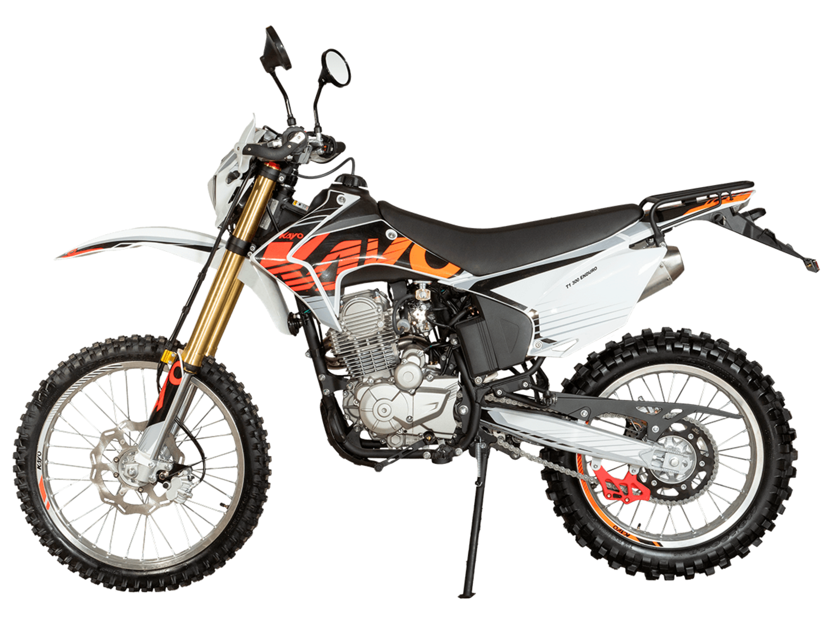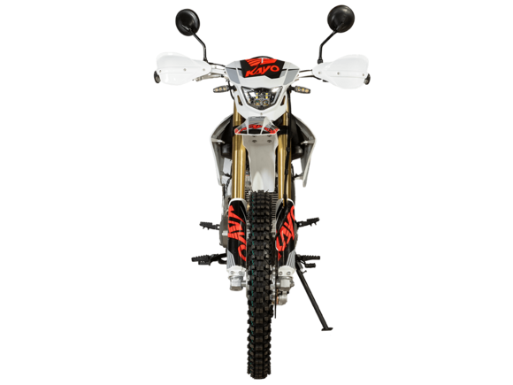Мотоцикл KAYO T1 300 Enduro 21/18 2025 ПТС – надёжный и производительный эндуро, готовый встретить вызовы внедорожных трасс.Оснащён 4-тактным двигателем объёмом 271 см³ с верхним распредвалом и воздушным типом охлаждения. Максимальная мощность в 24 л.с. развивает при 8500 об/мин, а максимальный крутящий момент 22 Нм при 6500 об/мин. За подачу топлива отвечает карбюратор PD30. Он обеспечивает плавность хода, топливную экономность и бесперебойную работу двигателя даже в самых жёстких условиях. Соотношение диаметра цилиндра и хода поршня 75,0х61,4. Степень сжатия 9,29:1. Запуск двигателя осуществляется с помощью электростартера или кикстартера. Тип зажигания CDI. Снизу установлена пластиковая защита двигателя.Механическая коробка передач имеет 5 ступеней. Привод цепной. Объём топливного бака 9 литров.На мотоцикл установлены спицованные колёса с алюминиевыми ободами, алюминиевыми ступицами и буксаторами. Обуты во внедорожные покрышки YUANXING 80/100-21 и 110/100-18.Длина подвески спереди 880 мм, длина задней подвески 380 мм. Задняя подвеска оснащена прогрессией. Траверсы выполнены из литого алюминия, а прогрессия – из стали. За торможение отвечают дисковые гидравлические тормоза.Прочная рама и маятник выполнены из стали. Мотоцикл имеет ПТС и оснащён всем необходимым для поездок по дорогам общего пользования: диодная светотехника (яркая фара, поворотники, стоп-сигнал), звуковой сигнал, цифровая приборная панель, зеркала заднего вида.Для управления установлен руль переменного сечения 28 мм Fatbar со стандартными рычагами сцепления и тормоза, на который установлена алюминиевая защита рычагов с широкими ветрозащитными щитками. Имеется платформа для перевозки грузов и дополнительные подножки для поездок с пассажиром.Габариты мотоцикла 2100х810х1180 мм, вес 119 кг. Клиренс 340 мм, колёсная база 1420 мм, высота по седлу 900 мм.