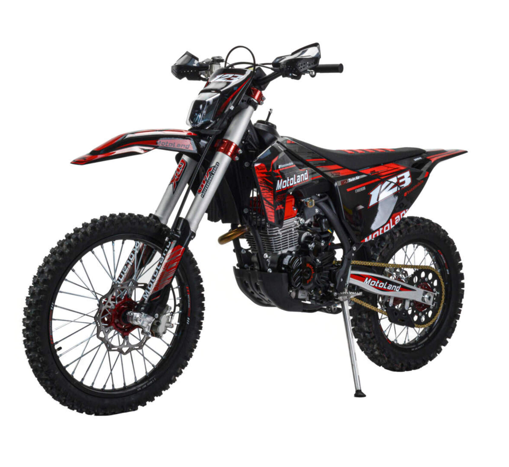 Мотоцикл Motoland XT300 STНадёжная техника оснащенная двигателем 175FMM (PR5 4 клапана) с водяным охлаждением. с кикстартером и электростартером, Мощностью 26 Л.С. на двигателе установлен Карбюратор NIBBI n34 с ускорительным насосом.Это полноразмерный кроссовый мотоцикл его база по осям составляет 1400 мм., и габаритами 2100х800х1120 мм. Высота по седлу составляет 950 мм. Передние и задний амортизаторы с регулировками.За счет сбалансированной базы мотоцикл имеет отличную управляемость, а конструкция рамы и особенности настройки подвески GPX способствуют максимальному поглощению неровностей дорожного покрытия, а так же усиленная прогрессия на игольчатых подшипниках. Алюминиевые обода c антибуксаторами, усиленными спицами и ступицами.На кроссовой резине 80/100-21 / 110/100-18На мотоцикле установлена обновлённая тормозная система обеспечивающая отличные тормозные характеристики. Глушитель с уникальным дизайном прямоточного типа, полностью алюминиевый для облегчения веса.