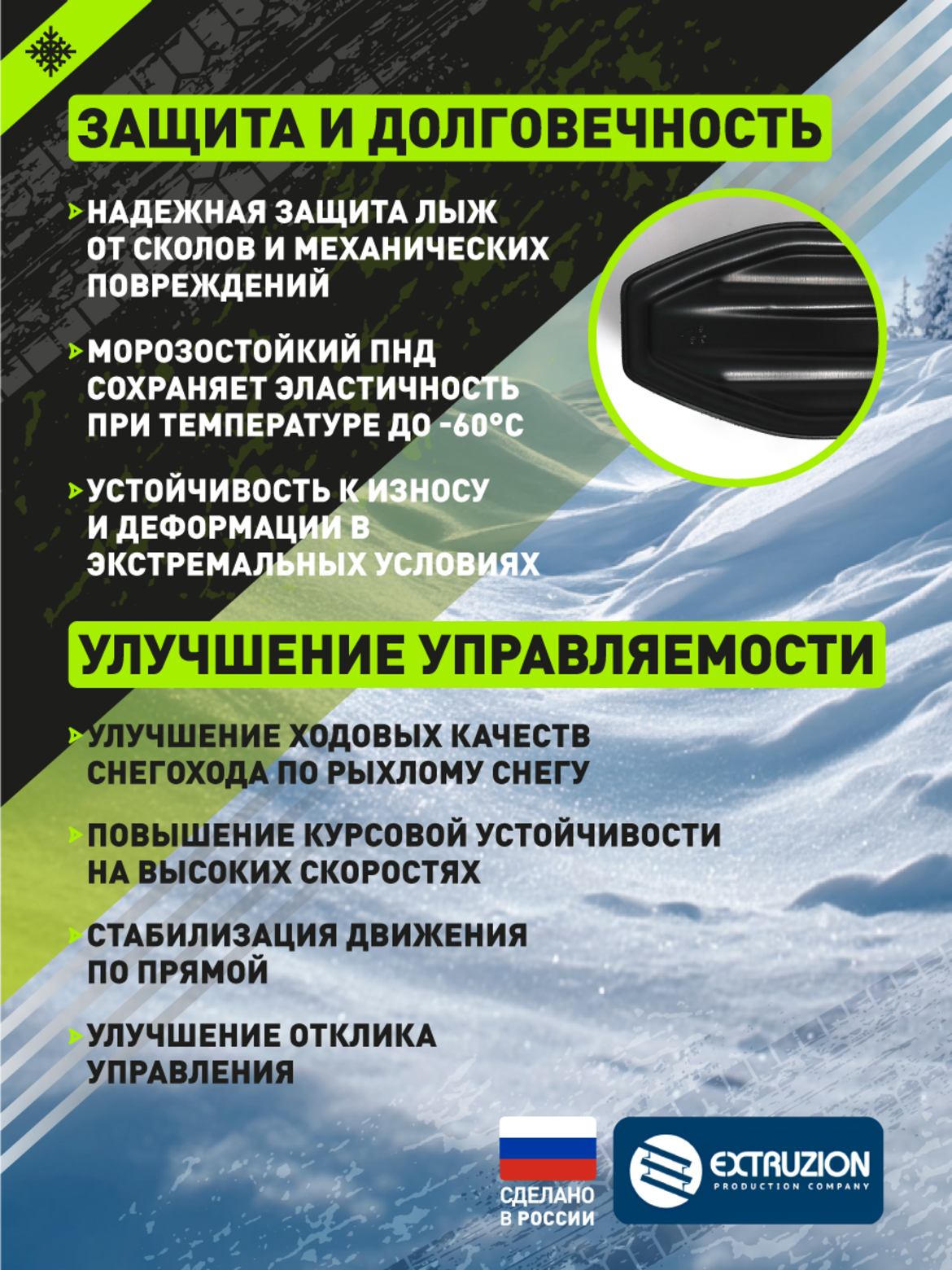 Надежная защита и долговечность. Защищает оригинальные лыжи от сколов, царапин и абразивного износа Изготовлена из морозостойкого ПНД, сохраняющего гибкость при -60C Принимает на себя основную нагрузку, продлевая срок службы лыж