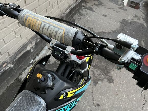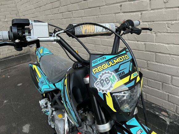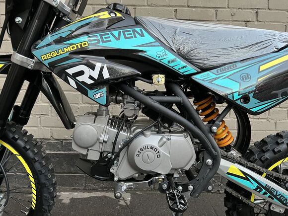 Представляем вниманию поклонников офф-роада и фри-райда питбайк Regulmoto Seven – новинку мототехники Regulmoto модельного ряда 2020 года. Regulmoto Seven – оптимальный выбор для райдера, который позволит своему владельцу совершенствовать навыки управления мототехникой на треке мотостадиона, а также получать максимальное удовольствие от офф-роад рейдов.В раме Regulmoto Seven установлен 125-кубовый 4-тактник YX с электростартером– этот двигатель отлично себя зарекомендовал в качестве надежного и простого силового агрегата. Подготовкой топливной смеси занимается карбюратор Nibbi PE19. Запуск мотора возможен как при помощи кнопки электростартера, так и привычной лапкой кика.Колеса питбайка размером 17/14 дюймов с усиленными алюминиевыми ободьями на 36 спиц «обуты» в качественную кроссовую моторезину Kenda. Установленные на колесах буксаторы предотвратят проворачивание покрышки и защитят камеры от возможных повреждений. Питбайк комплектуется фарой головного света; она включается при помощи поворота ключа в замке зажигания. В качестве элементов защитного обвеса используются пластиковые обтекатели типа CRF.Подбор комплектующих свидетельствует о полной готовности питбайка к покорению бездорожья. Среди стоковых компонентов мини-мотоцикла стоит отметить: