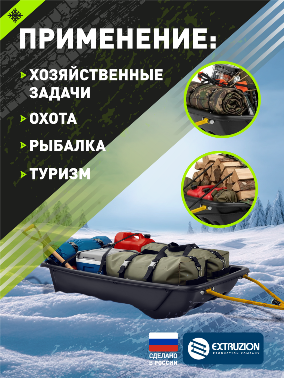 Мощные сани-прицеп премиум-класса, укомплектованные для перевозки крупных грузов снегоходами и мотобуксировщиками. Полная готовность к работе в экстремальных условиях.