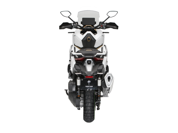 Скутер ZONTES ZT368-G – максискутер двойного назначения, готовый пронестись по улицам города за его пределы и отправиться по грунтовым тропам прокладывать свой маршрут туда, куда вам потребуется. Регулируемая подвеска с перевёрнутой телескопической вилкой спереди обеспечит отличную управляемость и устойчивость в любых условиях.Силовая установка представлена одноцилиндровым 4-тактным двигателем. Двигатель имеет объём 368 см³ и обеспечивает мощность в 38,8 л.с. Оснащён инжектором BOSCH, системой жидкостного охлаждения и вариатором. Запуск двигателя осуществляется с помощью бесключевого доступа.Ёмкость топливного бака 17,5 литра.Колёса имеют диаметр 17 дюймов спереди и 14 дюймов сзади. Для подвески спереди используется телескопическая вилка перевёрнутого типа, а сзади установлены 2 гидравлических амортизатора. Гидравлические дисковые тормоза произведены компанией J.JUAN, входящей в холдинг BREMBO. Мотоцикл также оснащён 2-канальной ABS-системой, противобуксовочной системой TCS System и датчиками давления в шинах.ZT350-G оборудован яркой LED-фарой, мультимедийной приборной панелью с TFT-дисплеем, имеются 2 USB-порта.Габариты скутера 2230х925х1290 мм. Колёсная база 1560 мм. Высота по седлу 795 мм. Вес 198 кг.
