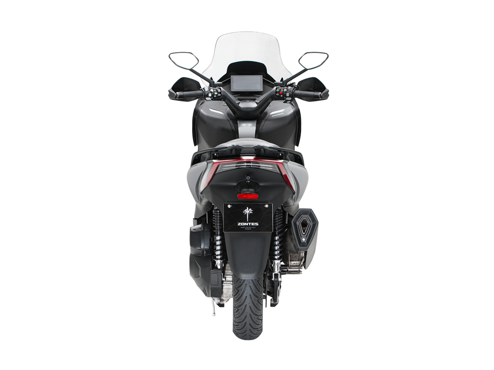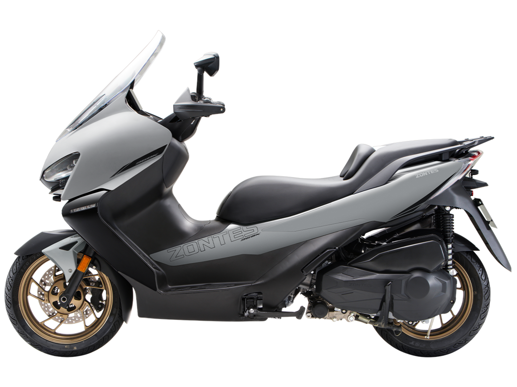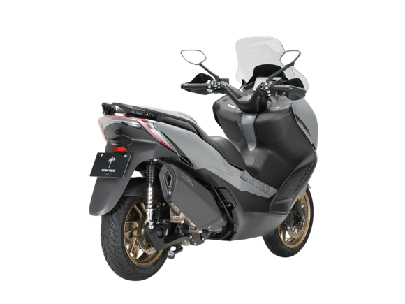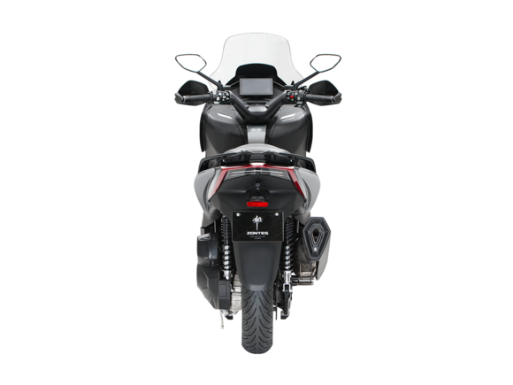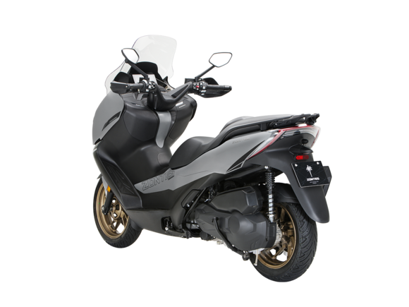 Скутер ZONTES ZT368-K – максискутер с богатым оснащением и строгим, стильным дизайном, готовый предложить максимум комфорта. В стоке имеет видеорегистратор, большой багажник и удобное сиденье со спинкой.Силовая установка представлена одноцилиндровым 4-тактным двигателем. Двигатель имеет объём 368 см³ и обеспечивает мощность в 38,8 л.с. Оснащён инжектором BOSCH, системой жидкостного охлаждения и вариатором. Запуск двигателя осуществляется с помощью бесключевого доступа.Ёмкость топливного бака 17 литров.Колёса имеют диаметр 15 дюймов спереди и 14 дюймов сзади. Для подвески спереди используется телескопическая вилка, а сзади установлены 2 амортизатора. Гидравлические дисковые тормоза произведены компанией J.JUAN, входящей в холдинг BREMBO. Мотоцикл также оснащён 2-канальной ABS-системой, противобуксовочной системой TCS System и датчиками давления в шинах.ZT350-K оборудован яркой LED-фарой, мультимедийной приборной панелью с TFT-дисплеем, имеются 2 USB-порта.Габариты скутера 2195х795х1395 мм. Колёсная база 1570 мм. Высота по седлу 770 мм. Вес 188 кг.