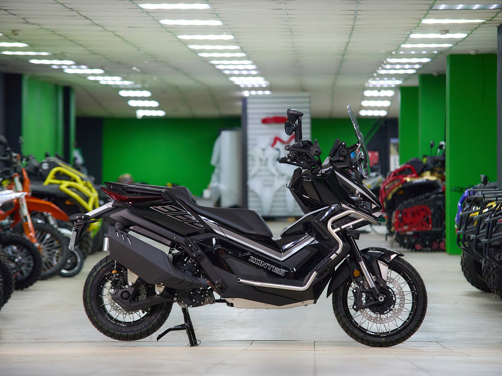 Скутер ZONTES ZT368-G – максискутер двойного назначения, готовый пронестись по улицам города за его пределы и отправиться по грунтовым тропам прокладывать свой маршрут туда, куда вам потребуется. Регулируемая подвеска с перевёрнутой телескопической вилкой спереди обеспечит отличную управляемость и устойчивость в любых условиях.Силовая установка представлена одноцилиндровым 4-тактным двигателем. Двигатель имеет объём 368 см³ и обеспечивает мощность в 38,8 л.с. Оснащён инжектором BOSCH, системой жидкостного охлаждения и вариатором. Запуск двигателя осуществляется с помощью бесключевого доступа.Ёмкость топливного бака 17,5 литра.Колёса имеют диаметр 17 дюймов спереди и 14 дюймов сзади. Для подвески спереди используется телескопическая вилка перевёрнутого типа, а сзади установлены 2 гидравлических амортизатора. Гидравлические дисковые тормоза произведены компанией J.JUAN, входящей в холдинг BREMBO. Мотоцикл также оснащён 2-канальной ABS-системой, противобуксовочной системой TCS System и датчиками давления в шинах.ZT350-G оборудован яркой LED-фарой, мультимедийной приборной панелью с TFT-дисплеем, имеются 2 USB-порта.Габариты скутера 2230х925х1290 мм. Колёсная база 1560 мм. Высота по седлу 795 мм. Вес 198 кг.