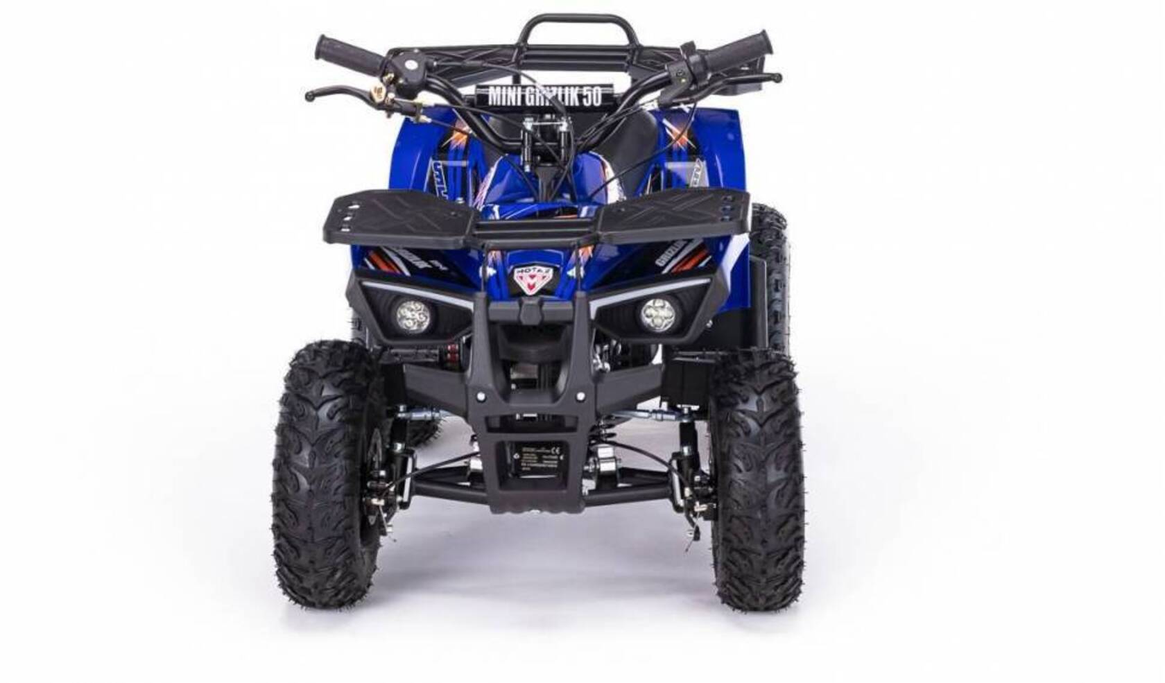 Детский бензиновый квадроцикл Motax Grizlik X-16 PS с механическим стартером подойдет детям от 3-х до 8-ми лет. Транспорт оборудован двухтактным двигателем, мощностью 3,5 л.с. Оснащен металлическими багажниками (спереди и сзади), отбойником, яркой оптикой. Система запуска - ручной стартер нового типа (легкий запуск). Разгоняется до 45 км/ч. Предусмотрен ограничитель скоростного режима. Допустимая нагрузка на изделие не должна превышать 60 кг.