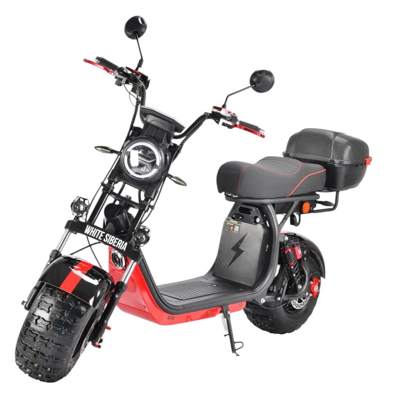 Первый полноприводный скутер WHITE SIBERIA PRO 2WD 4000W класса CityCoco на рынке стран СНГ. Два мотор-колеса мощностью 2000 Вт (суммарная мощность 4000 Вт) в сочетании с полным приводом и 8-дюймовыми колесами позволят Вам преодолеть пересеченную местность без проблем и забот.Данная модель станет лучшим выбором для охотников, рыболовов и любителей путешествий по бездорожью. В кофре Вы без проблем уместите габаритный груз, а в бардачок под сиденьем сможете положить документы, деньги и другие ценные вещи. Эта практичная и стильная модель непременно порадует Вас и подарит множество приятных поездок как в условиях города, так и за его пределами.Преимущества:LED-оптика яркая, заметная и потребляет электричество экономно;Настраиваемые ручки тормоза позволяют подобрать идеально удобное положение;Скутер может проехать до 80 км на одном заряде при комплектации двумя батареями;Сиденье мягкое, широкое, удобное и прекрасно подходит для длительных поездок.Верх сиденья отделан прочной и долговечной эко-кожей, которая устойчива к воздействию влаги и ультрафиолета;Бокс выполнен из прочного пластика и снабжен дополнительным фиксатором верхней крышки;Установлен большой LED-дисплей;Колеса с дорожной резиной.Состоит из светодиодных ламп. LED-оптика яркая, заметная и потребляет электричество экономно. Она обеспечивает отличное освещение и безопасность при движении на дорогах. Ручки газа выполнены из алюминия с каучуковым покрытием, прочным и прочным на ощупь. Настраиваемые ручки тормоза позволяют подобрать идеально удобное положение. Интуитивно понятные кнопки переключения скоростей и света выполнены в классическом стиле.Скутер может проехать до 80 км на одном заряде при комплектации двумя батареями. При классической комплектации одной батарей — до 50 км. Батарея сертифицирована и обладает умной BMS платой 40A, которая защищает АКБ от перезаряда и перегрузки. Классическое сиденье, единое для всей линейки моделей WS. Оно мягкое, широкое, удобное и прекрасно подходит для длительных поездок. Верх сиденья отделан прочной и долговечной эко-кожей, которая устойчива к воздействию влаги и ультрафиолета.Бокс выполнен из прочного пластика и снабжен дополнительным фиксатором верхней крышки. Усиленный держатель бокса способен выдержать нагрузку до 50 кг.В корпус встроен катафот и предусмотрено место для установки дополнительного света. Вы можете демонтировать бокс и установить на его место классическую спинку для второго пассажира, которая идет в комплекте. На модели установлен большой LED-дисплей, отображающий скорость, заряд батареи, индикатор света и пройденную дистанцию. В стандартной комплектации поставляется на 8-дюймовых колесах с дорожной резиной. Для поездок по пересеченной местности и серьезного бездорожья рекомендуется установка комплекта грязевой резины.