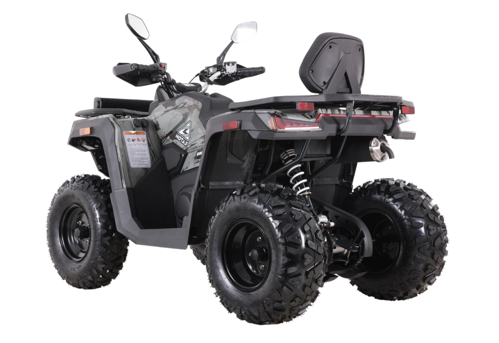 Передняя маятниковая (рычажная) подвеска обеспечивает отличную управляемость и комфорт во время движения по неровной местности. С дорожным просветом в 150 мм и высотой по сидению 800 мм, квадроцикл подходит для пользователей ростом от 150 см и выше, обеспечивая удобство и безопасность.