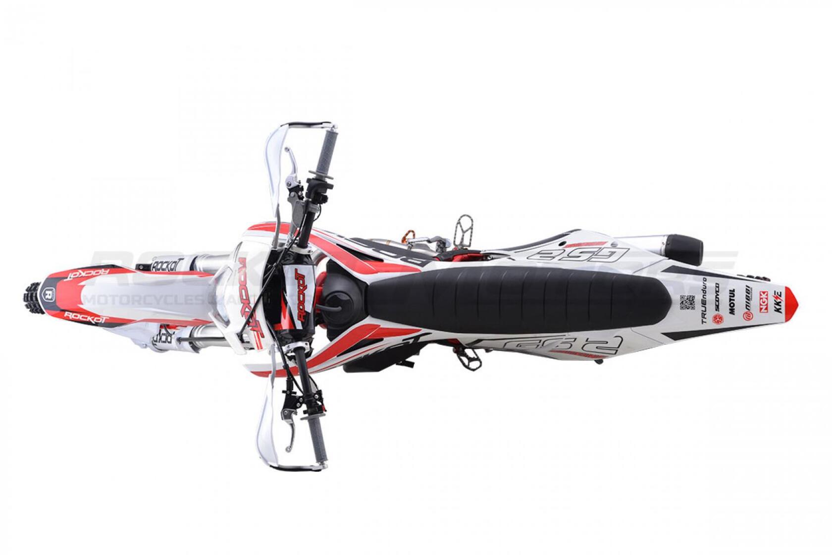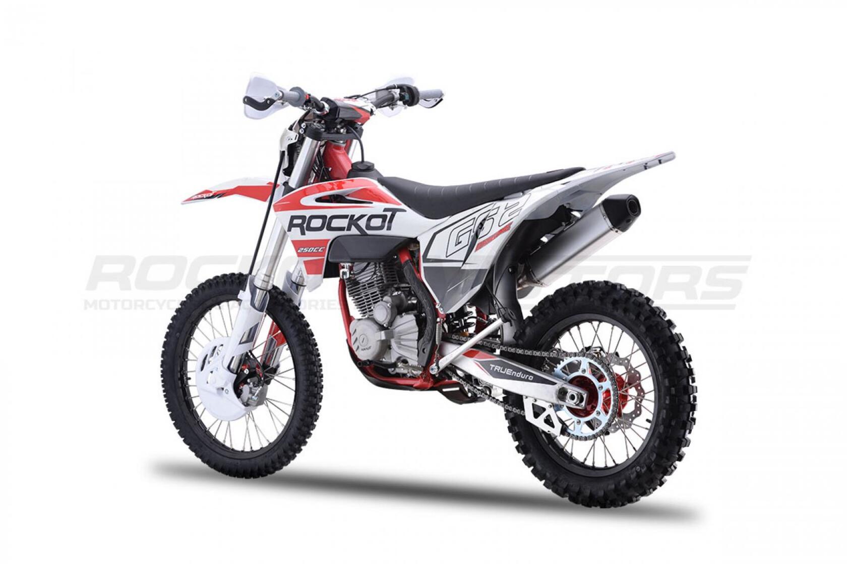 Вторая, обновленная версия эндуро мотоцикла ROCKOT GS 2 Origine.GS 2 Origine - полноразмерный эндуро мотоцикл, удовлетворяющий вкусу и потребностям как новичков, так и опытных райдеров.Мотоциклы ROCKOT серии GS, обрели высокую популярность, благодаря применению в плане дизайнерского и практического решения - пластика модели GASGAS.На белый пластик, нанесена графика в белой, красной, черной расцветке. Выбранное цветовое решение, придает мотоциклу броский, стильный дизайн, так характерный для внедорожной техники. Каждая деталь мотоцикла, дополняет общую концепцию дизайна.Обода колесных дисков окрашены в черный цвет, а красная графика нанесенная в виде наклеек, защитит ЛКП ободов от царапин. Алюминиевые ступицы окрашены в яркий, красный цвет.На черной раме установлена защита красно-черного цвета. Также, в красном цвете представлены: CNC крышка топливного бака и обслуживаемый топливный фильтр. Защита рук, складные, алюминиевые рычаги и траверсы окрашены в черный цвет.Предыдущая версия эндуро мотоцикла ROCKOT GS 2 Origine оснащалась двигателем CB250-F 172FMM-3A. Обновленный GS 2, обрел новый двигатель PR250 172FMM-5, с балансирным валом и пятиступенчатой КПП.Балансирный вал, значительно снижает уровень вибрации от двигателя, что ранее было единственным минусом двигателя CB250-F. Особенностью двигателя, можно считать то, что мощность двигателя осталась прежней - 21 лошадиная сила.За образование топливной смеси и ее подачу в двигатель, отвечает производительный карбюратор PE30. Повышает характеристики мощности и крутящего момента - обновленный “PowerBomb” увеличенного объема. Коробка передач - пятиступенчатая, с многодисковым сцеплением.ROCKOT GS 2 Origine построен на новой раме S8, которая является улучшенной, доработанной версией популярной рамы K8, аналогичной по геометрии рамам “австрийской троицы”. Рама производится из труб шестигранного сечения хром-молибденовой стали, которая является очень прочной и легкой. Подрамник производится из алюминия. Геометрия рамы, благодаря правильно выверенному центру тяжести и углу наклона вилки - способствует наилучшей управляемости устойчивости мотоцикла на низкой скорости.Устанавливаемая на мотоцикл ROCKOT GS 2 Origine подвеска известной фирмы “KKE” - делает мотоцикл одним из наиболее подходящих для проезда по сложным эндуро маршрутам. Спереди расположена телескопическая вилка перевернутого типа, длиной - 940 мм и толщиной рабочего штока - 48 мм. Конструкция вилки - регулируемая с картриджем открытого типа. Данная конструкция подвески отлично проявляет себя в эндуро, в том числе и в режиме гонки.Сзади установлен усиленный маятник из алюминия, который соединен с задним моноамортизатором, посредством системы рычагов прогрессии. Моноамортизатор “KKE” длиной 470 мм, регулируется на скорость сжатия, скорость отбоя и преднатяжение пружины. Широкий диапазон регулировки передней и задней подвески, позволит точно настроить ее работу под вес и стиль езды каждого райдера. Система прогрессии, обеспечивает равномерную, мягкую работу и увеличивает длину рабочего хода подвески.