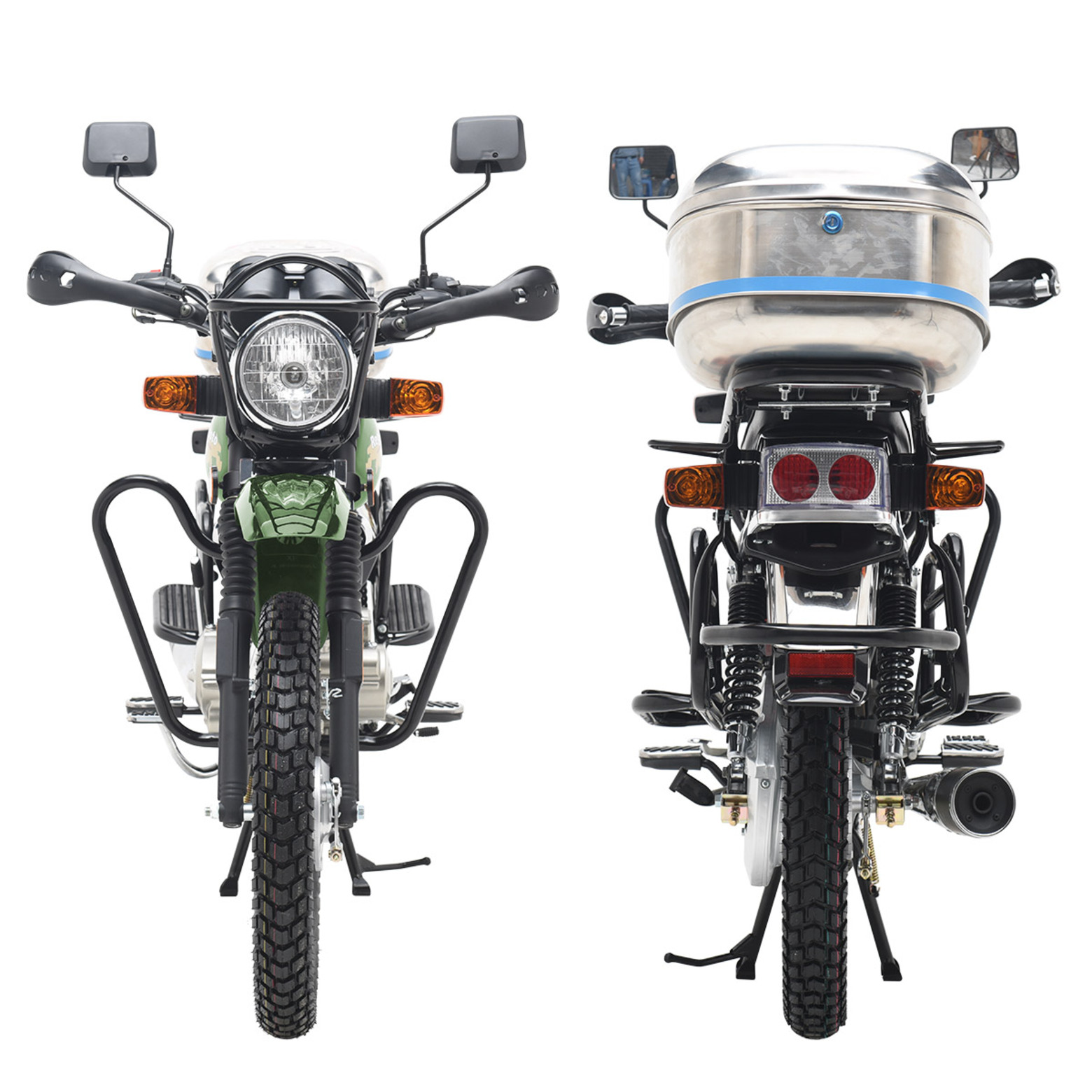 Мотоцикл Regulmoto SK 150-22 – классический «дорожник» с надежным и экономичным малокубатурным двигателем. Данная модель изготавливается на собственных мощностях крупного китайского производителя Senke.Несмотря на классический внешний вид Regulmoto SK 150-22 отличается достаточно интересным и продуманным дизайном. В раме мотоцикла установлен одноцилиндровый 4-тактник с воздушным охлаждением с рабочим объемом в 149 см3. Двигатель можно запускать как кнопкой электростартера, так и при помощи традиционного кик-стартера. В целом байк выглядит лаконичным и современным – еще одной приметой актуальных трендов стали спицованные диски переднего 18-дюймового и заднего 18-дюймового колес. Характерная для «дорожников» подвеска представлена телескопической вилкой спереди и двумя амортизаторами сзади.Широкое комфортное сиденье и вместительный бак Regulmoto SK 150-22 недвусмысленно указывают на назначение мотоцикла, окончательную ясность вносят багажник, складывающиеся пассажирские подножки и наличие мощной центральной подножки. Безопасность эксплуатации на дорогах общего пользования обеспечивают обязательный комплект зеркал заднего вида и светового оборудования, включающего фару головного света, светодиодные поворотники и стоп-сигнал. Этот мотоцикл станет отличным выбором в качестве транспортного средства на каждый день и позволит своему обладателю с комфортом решать широкий круг повседневных задач.