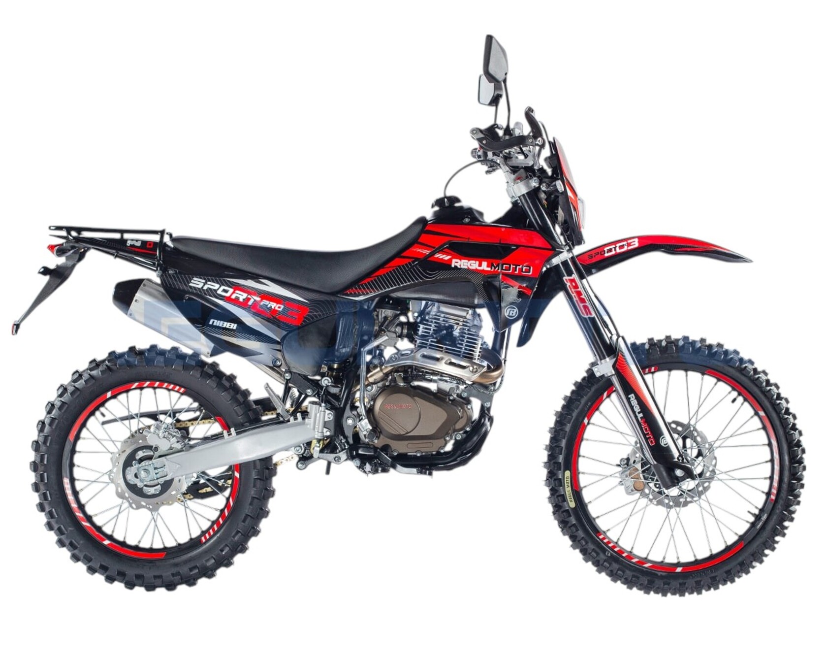Мотоцикл Regulmoto Sport-003 PR PRO. - Двигатель 172, балансир, 300 поршевая Zongshen, алюминиевые обода, злая резина, новый пластик облицовки бензобака, колодки синтетика.Передние амортизаторы с быстрой регулировкой, 41мм. Алюминиевые диски из одного из самых прочных сплавов 7116. Из этого сплава производятся рули Renthal. Шины с увеличенными грунтозацепами, мягкий компаунд.