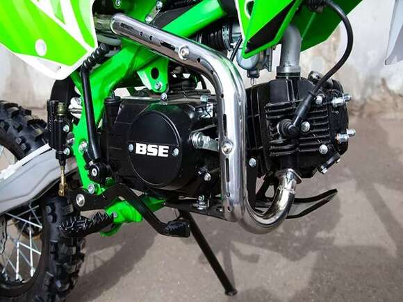 Питбайк BSE MX125 17/14 Racing Green - отличный выбор для тех, кто делает первые шаги в мире спорта, кросса и оффроада. В оригинальной, усиленной, хромомолибденовой раме BSE, устанавливается мощный 4-х тактный двигатель Zonghshen 125 куб см с воздушным охлаждением и 4-ступенчатой коробкой, в рабочем тандеме с спортивным карбюратором MIKUNI VM 22 способный развивать мощность 10 лошадиных сил. Удлиненная колесная база и превосходная подвеска увеличивает курсовую устойчивость питбайка и позволяет райдеру с большим комфортом управлять им на прямых участках трассы и с легкостью проходить "острые" повороты и подъёмы и любые неровности. Мощная тормозная система HSK Racing c армированными тормозными шлангами.Подвеска питбайка базируется на традиционном выборе комплектующих: телескопическая вилка-«перевертыш» впереди и моноамортизатор сзади. Настройки отбоя/сжатия имеются только у заднего амортизатора, работа вилки корректируется заменой масла. MX 125 укомплектован резиной с увеличенным грунтозацепом, фильтрбоксом, короткоходной ручой газа.